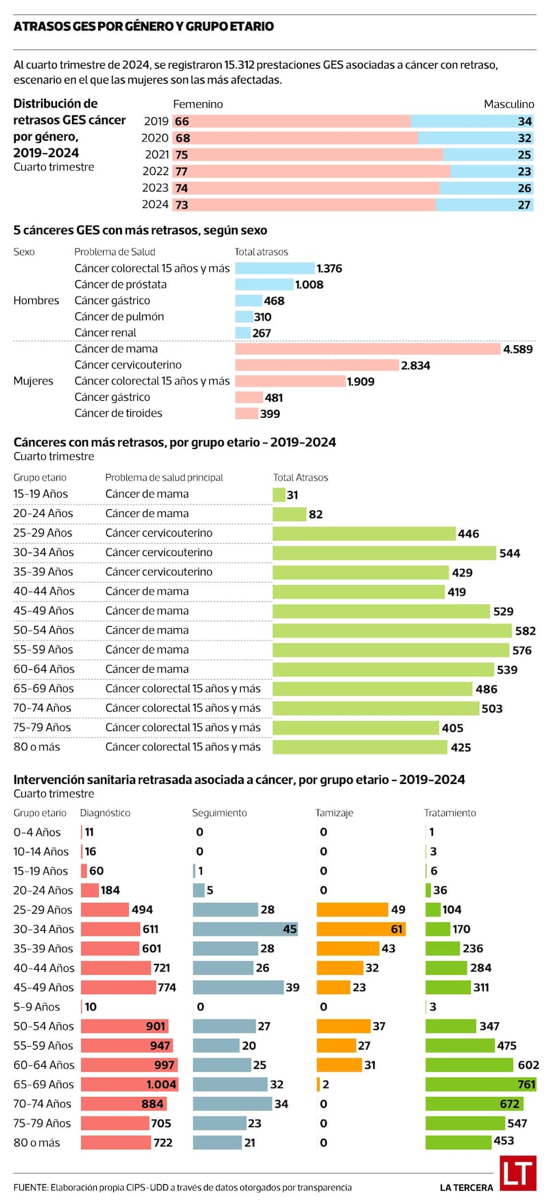 En el último trimestre de 2024, más de 15 mil prestaciones oncológicas GES presentaban retraso. “El 73% de los atrasos corresponde a mujeres y el cáncer de mama lidera estas prestaciones atrasadas”, subraya Paula Daza, directora ejecutiva del CIPS-UDD.