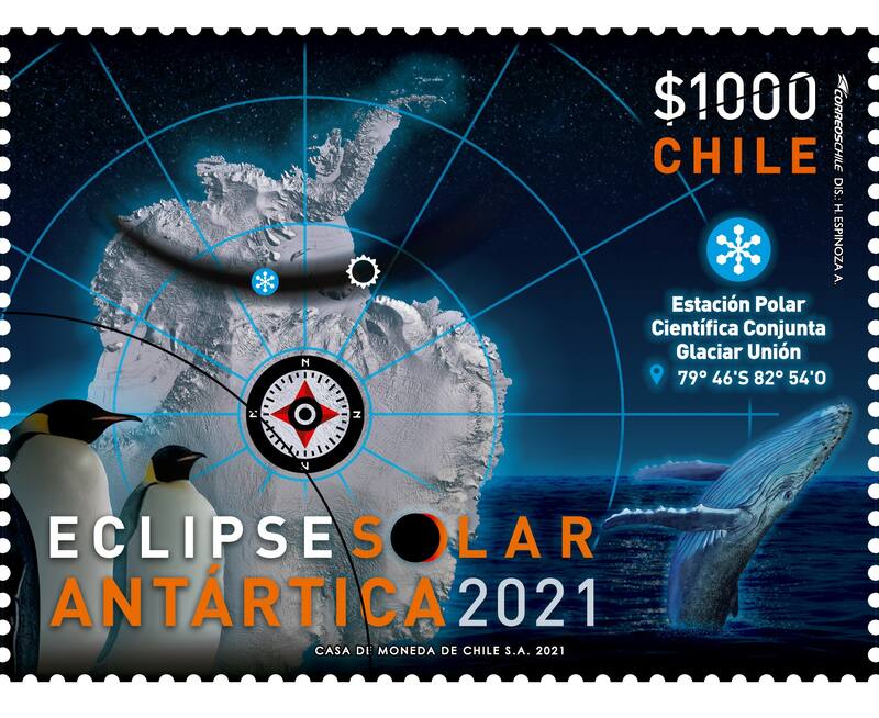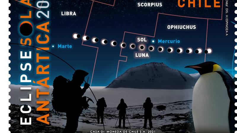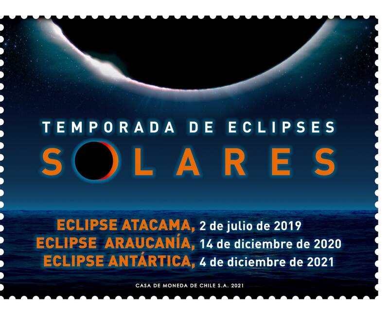 El lanzamiento de un nuevo sello postal, se utiliza en muchas ocasiones para conmemorar algún evento en particular, y plasmarlo en la historia. Así, durante los años 2019 y 2020, CorreosChile ha emitido dos sellos conmemorando los eclipses solares totales que han ocurrido en territorio chileno, el primero en las regiones de Atacama y Coquimbo, y el segundo en las Regiones de la Araucanía y Los Ríos. Este año, junto con el Ministerio de Ciencia y la ayuda de dos astrónomos, Correos emitió un nuevo sello conmemorativo del eclipse solar total del 4 de diciembre en la Antártica. De esta forma, Chile es el primer país en emitir tres sellos de eclipses solares totales en años consecutivos. Esta serie de sellos, además de conmemorar la temporada de eclipses, recorre los distintos paisajes que encontramos a lo largo de nuestro país, desde el caluroso desierto de Atacama, pasando por los verdes parajes de la Costa Araucanía y terminado en los gélidos entornos del territorio antártico chileno. Una característica muy relevante de este eclipse, es que se trata del segundo registrado en la historia desde terreno antártico, luego del ocurrido el año 2003, debido a que los eclipses ocurridos previamente no fueron registrados al no existir ningún campamento o asentamiento humano a lo largo de la línea de totalidad de los eclipses.