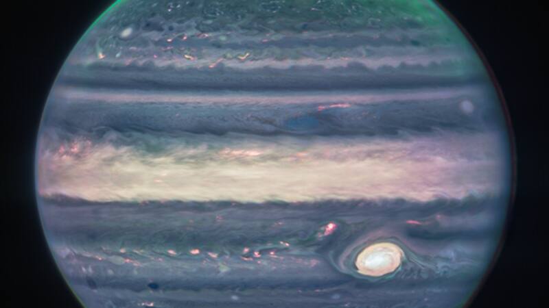 Se trata de una fotografía impresionante, en la que vemos las franjas que cruzan al planeta de forma horizontal -que corresponden a grandes masas de nubes que se mueven-, así como también podemos apreciar la clásica gran mancha roja que, en este caso, se ve blanca debido a que el JWST está observando la luz infrarroja del planeta y no la que nosotros veríamos con nuestros ojos si estuviésemos allí. Además, una de las cosas que al menos a mí me llama mucho la atención, son los hipnotizantes brillos de color anaranjado que vemos en los polos.