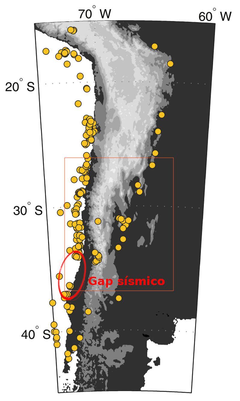 Sismicidad superficial en Chile, marcando el gap sísmico en rojo. Tomado del trabajo de Benjamin Brooks y sus colegas, publicado el 2003.
