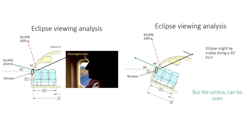 “El eclipse se compone del sector de completa oscuridad que proyecta la sombra de luna frente al sol, llamado umbra, y el sol eclipsado por la luna. Por la hora (13 horas) era difícil, así que optamos por un minuto de umbra y un viraje abrupto e inclinado para ver el fenómeno. Demandó una semana de cálculos -versus un año de plazo en 2019-, y en el viaje hubo vientos fuertes, estábamos atrasados un minuto 30 y había que mantener la altitud porque había un avión cerca. Por suerte, la trigonometría no falla”, explica von Storch.