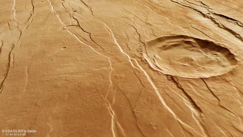 A lo largo de esta imagen de Mars Express, se pueden ver numerosos grabens que se extienden aproximadamente de noreste (abajo a la derecha) a suroeste (arriba a la izquierda).