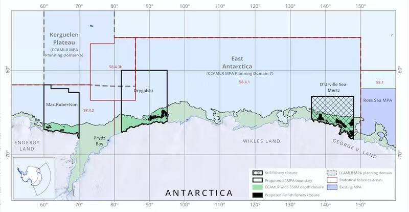 El área marina protegida propuesta para la Región Antártica Oriental constaba inicialmente de siete áreas distintas diseñadas para proteger la diversidad de entornos en la región. Desde entonces, Australia y sus socios, que ahora suman 17, han hecho muchos compromisos en la búsqueda del consenso. El número de áreas distintas se ha reducido a tres y la pesca está permitida a menos que se excluya explícitamente.