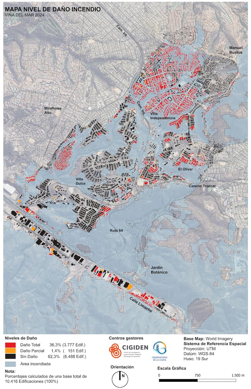 En la zona de los incendios, incluyendo El Salto, Villa Independencia, Villa Dulce, El Olivar, Manuel Bustos, y Miraflores Alto, fueron identificadas un total de 10.416 edificaciones, de las cuales 3.777 resultaron con daño total, 151 con daño parcial, en tanto que 6.488 no presentan daño.