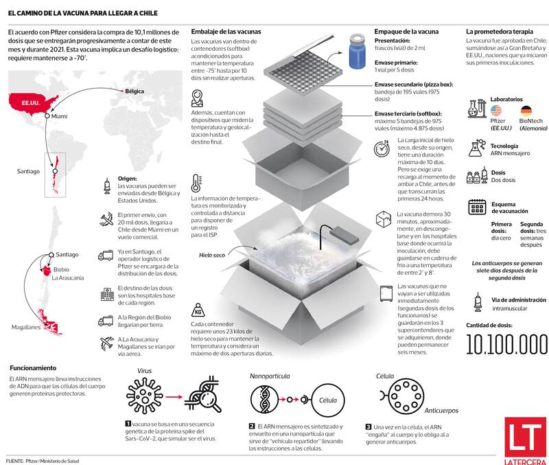 Los 10,1 millones de dosis comprometidas pueden llegar a Chile desde EE.UU. o Bélgica, en contenedores de hielo seco que mantienen la vacuna a -70°. Y el primer envío, que llegaría la próxima semana, se distribuirá desde Santiago, por vía aérea y terrestre, hacia los hospitales bases, para iniciar la inmunización.