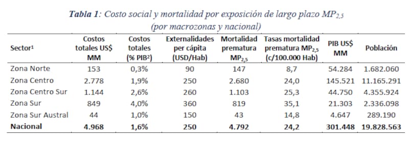 Chile es un país con niveles críticos de contaminación, señala el informe, e indica que al valorizar económicamente los perjuicios en la salud atribuibles al MP2,5,se totaliza un costo aproximado de US$5.000 millones por año, equivalente a 1,6% del PIB anual, producto principalmente de la mortalidad prematura.