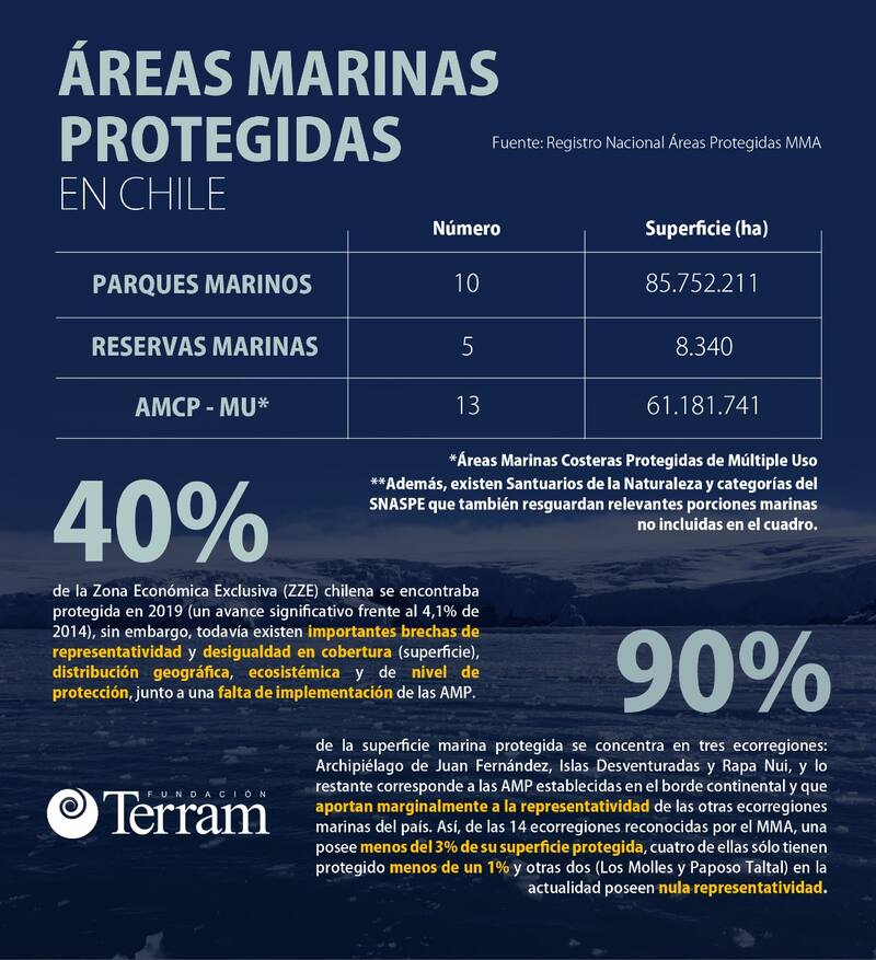 La directora ejecutiva de Fundación Terram, Flavia Liberona, dice que si bien Chile ha avanzado en la creación de áreas protegidas marinas "aún existen enormes desafíos relacionados con brechas de representatividad de ecosistemas y desigualdad de cobertura. También hay que destacar que la mayoría de la superficie protegida se encuentra alejada de la zona costera, en la cual ocurren importantes procesos ecológicos y la mayor intervención antrópica”, explica.