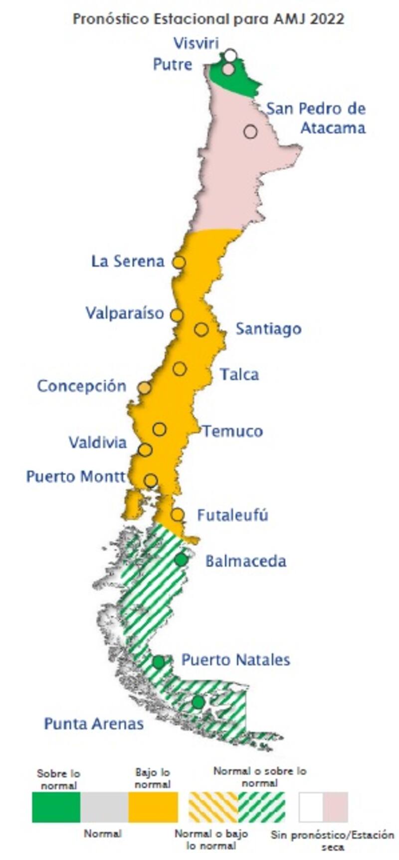 Uno de los puntos más afectados es la Región Metropolitana, y particularmente Santiago. El escenario no es favorable, así lo confirma el pronóstico estacional de la Dirección Meteorológica de Chile (DMC) para el período abril, mayo y junio, señalando que para el cuarto mes del año, así como para todo el trimestre, las lluvias serán en menor cantidad que lo normal. Este punto no es exclusivo de la zona central, corresponde a gran parte del país, puntualmente entre la Región de Coquimbo y Los Lagos.