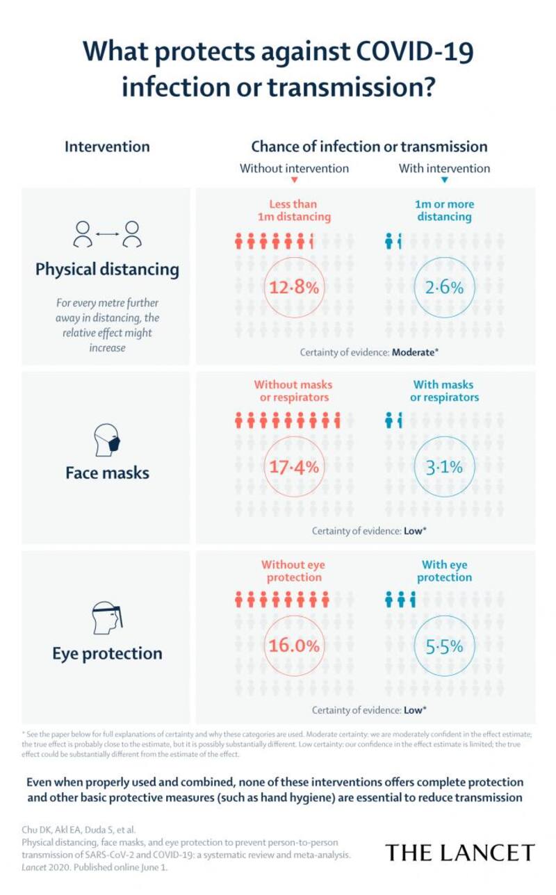 Para el análisis, un equipo internacional de investigadores realizó una revisión de 172 estudios observacionales de 16 países donde se evaluaban aspectos como medidas de distancia, máscaras faciales y protección ocular para prevenir la transmisión entre pacientes contagiados o probables con Covid-19, Sars o Mers y personas cercanas a ellos como familiares o trabajadores de la salud, hasta el 3 de mayo pasado.