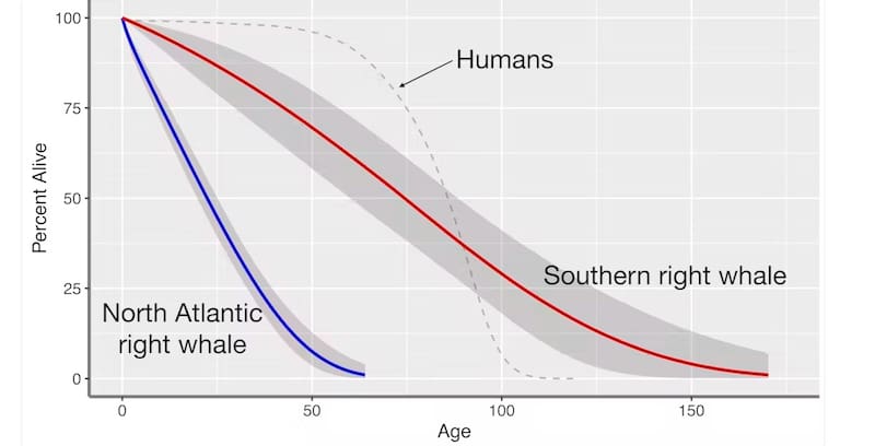 Estas dos especies están muy relacionadas (hace tan solo 25 años se las consideraba una sola especie), por lo que cabría esperar que tuvieran una longevidad similar. Atribuimos la marcada diferencia en la longevidad de las ballenas francas del Atlántico Norte a la mortalidad causada por los humanos, principalmente por enredos en aparejos de pesca y colisiones con barcos.