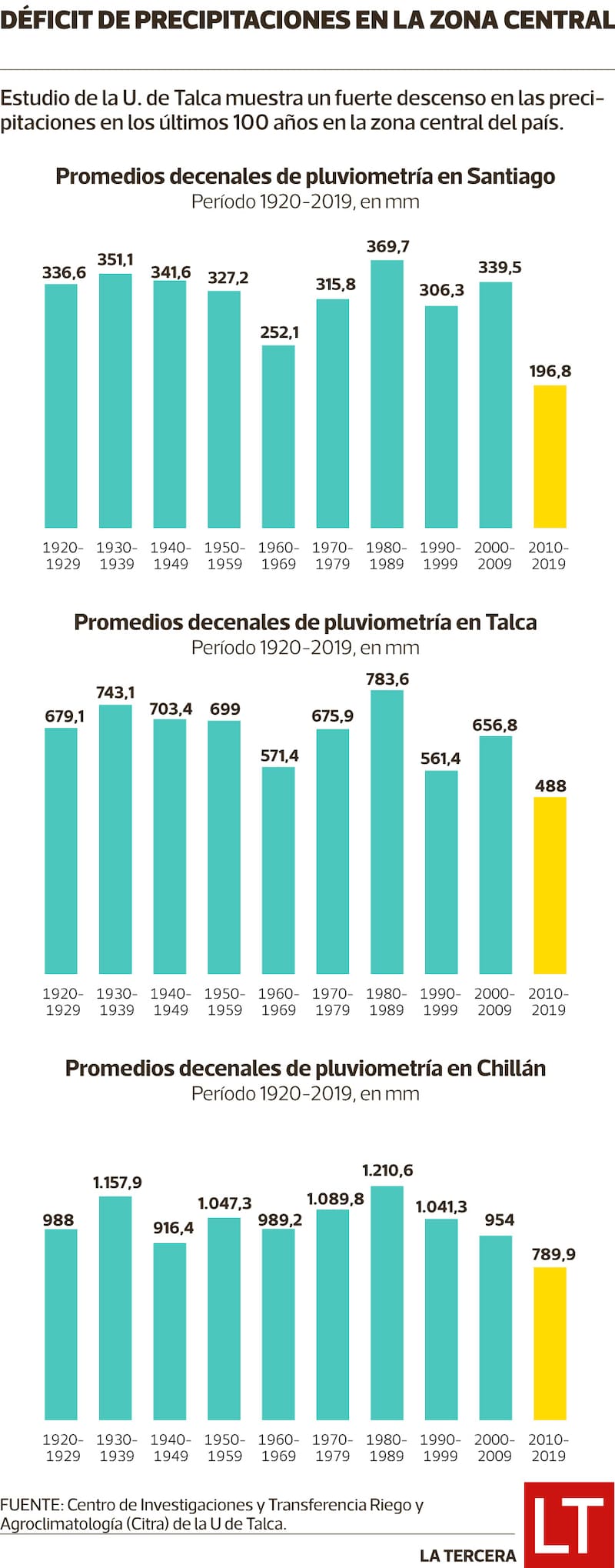 El estudio indica que entre 1920 y 2009 en Santiago se observa que, en promedio, las precipitaciones por década superaron los 300 milímetros, a excepción del período 1960-1969, en el cual descendió a 252,1 mm, producto de los años deficitarios 1962, 1964 y la extensa sequía 1967, 1968 y 1969. Sin embargo, en la década 2010-2019 se concentra el menor promedio de la muestra, con solo 196,8 milímetros.