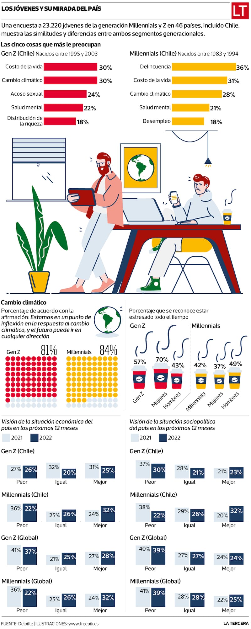 Son algunas de las conclusiones que arrojó el estudio “2022 Gen Z and Millennial Survey” elaborado por la consultora Deloitte sobre las diferencias y similitudes de ambas generaciones, que consideró la opinión de 23.220 personas de 46 países, incluido Chile, donde participaron 400 jóvenes (300 Millennials y 100 de la Generación Z).