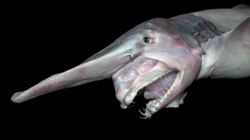 El tiburón duende (Mitsukurina owstoni) es un animal extraño con un hocico largo y plano y mandíbulas dentudas que sobresalen frente a la cara para atrapar presas desprevenidas. Es un tiburón de aguas profundas relativamente raro que vive en todos los océanos principales. Con un rostro que solo una madre podría amar, fue descrito como " grotesco " cuando se encontró por primera vez en 1910.