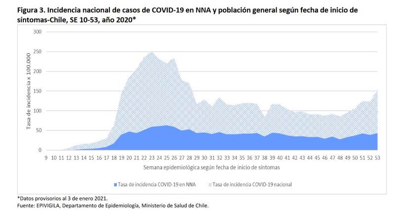 ¿Cómo ha sido el comportamiento en Chile? Los niños, niñas y adolescentes (NNA) no han estado exentos de las consecuencias de la pandemia, señalan datos preliminares del último Informe Epidemiológico en Niños con Covid-19 del Ministerio de Salud (Minsal) publicado en la web de este servicio, que establece que en población entre 0 y 18 años hasta la semana 53 de registro de la pandemia (3 de enero) se han notificado 73.529 casos de Covid-19. Eso representa una tasa de incidencia acumulada de 1553,3 casos por cada 100 mil NNA según fecha de inicio de síntomas.