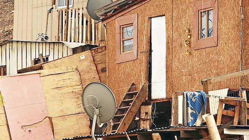 Al hacinamiento se agregan las condiciones de precariedad del material de las casas. Aspectos a los que se agregan diferencias en las condiciones materiales o de construcción de esos hogares. En los hogares del grupo D y E el material que predomina en el exterior de la vivienda es un muro de tabique (40%), lo que en el grupo ABC1 alcanza el 12%.