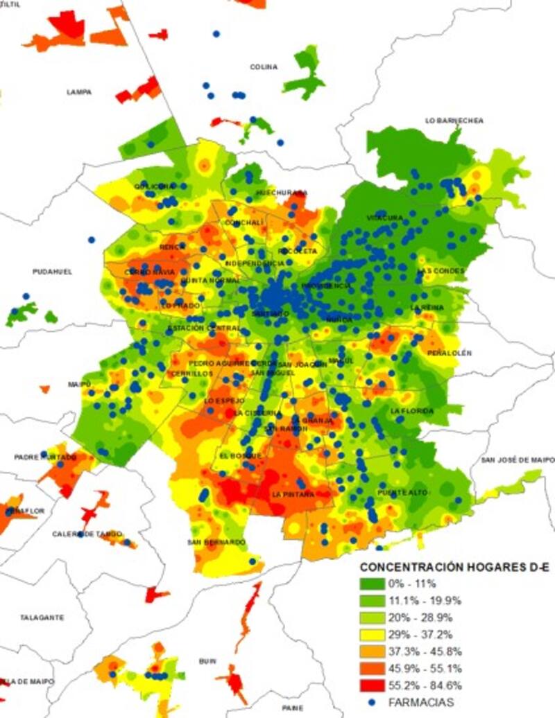 Si las viviendas muestran diferencias, también lo hace el contexto en el cual se sitúan. Eso se aprecia, por ejemplo, que en el caso de los hogares ABC1 el 86% cuenta con una farmacia a menos de 20 cuadras, eso es de 77,2% en C2 y C3, y 61,1% en D y E.