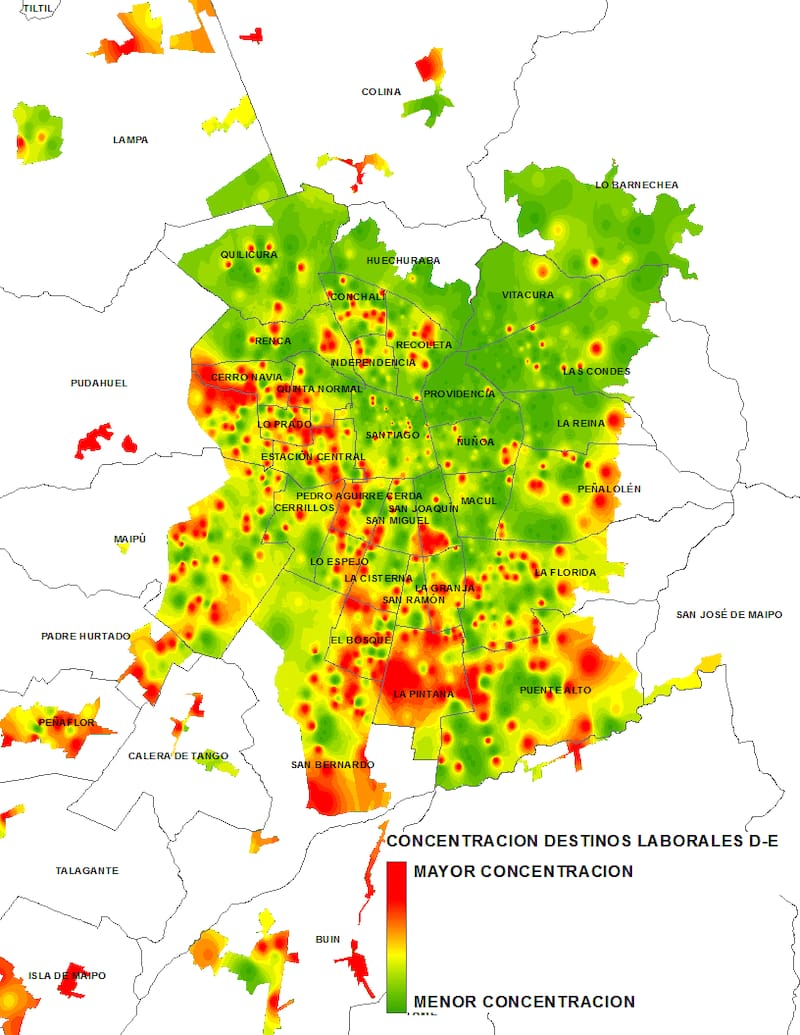 Estas diferencias, dado el contexto territorial de distribución de los grupos socioeconómicos en la Región Metropolitana, hace que el “otro” distinto deje de ser visible. “Los segmentos de más bajos ingresos deben recorrer la ciudad para ir a sus lugares de trabajo, por lo tanto, son conscientes de la diferencia. No así en los segmentos de más ingresos donde normalmente existe poca diferencia- y normalmente poca distancia- entre las características del entorno donde viven y donde trabajan”, explica Munita. Lo que se grafica en los mapas de calor (abajo) que representan la ubicación del destino por motivos laborales en la encuesta de Origen y Destino 2012, el primero del segmento D y E, y el último del segmento ABC1.
