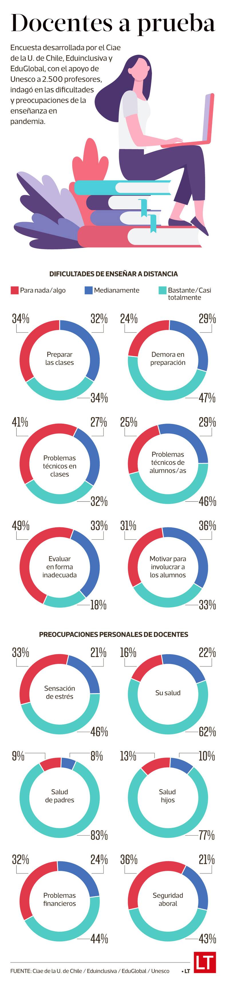 Estudio realizado a 2.500 profesores, señala que casi el 70% indicó como problema de mediano o bastante alcance, su dificultad para diseñar “clases estimulantes” en las nuevas circunstancias. El 51% dice que tuvo problemas para evaluar y 67% admite sensación de estrés.