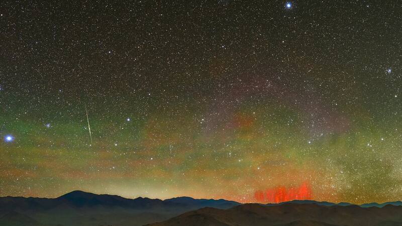 Esta fotografía fue tomada desde la plataforma del Telescopio de 3,6 metros de ESO, en La Silla, en medio del desierto chileno de Atacama. Debido a su gran altitud y a la ausencia de contaminación lumínica, La Silla es perfecta para captar estos inusuales fenómenos.