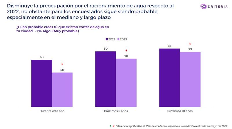 El análisis cuantitativo consideró 1.007 casos de hombres y mujeres entre 18 y 70 años, estableciendo que el 50% de los chilenos cree que habrá racionamiento de agua este año, el 70% en los próximos cinco años, mientras que el 79% en la próxima década. Las tres interrogantes descendieron en relación al análisis realizado en 2022 (ver gráfico a continuación).