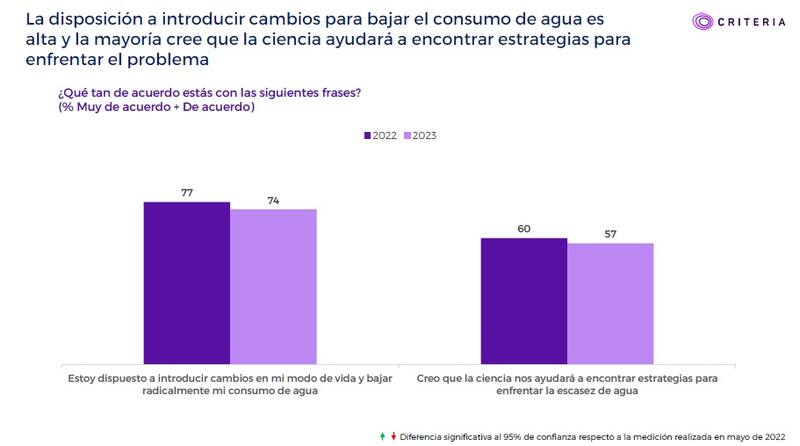 El estudio de Criteria declara que a pesar de que sigue siendo alto el temor por los efectos que tendrá la escasez de agua a nivel personal, este temor disminuye respecto al estudio de 2022. El 78% señala que le importa la escasez hídrica, pero no hace nada para evitarlo. El 65% de los encuestados siente temor por los efectos que tendrá la escasez en su vida.