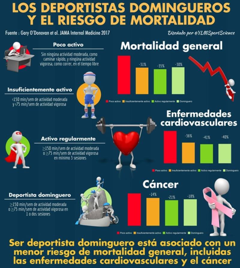 El ‘deportista dominguero’ logra cumplir con las recomendaciones de actividad física en uno o dos días a la semana. Nuestro estudio sobre los beneficios de ser deportista dominguero fue uno de los estudios más comentados en el mundo en 2017. Investigamos la asociación entre actividad física de tiempo libre con mortalidad en más de 60.000 adultos en Inglaterra y Escocia. Encontramos que el riesgo de mortalidad general fue alrededor de 30% menor en los deportistas domingueros en comparación con aquellos que no realizaron actividad física en su tiempo libre (ver infografía).