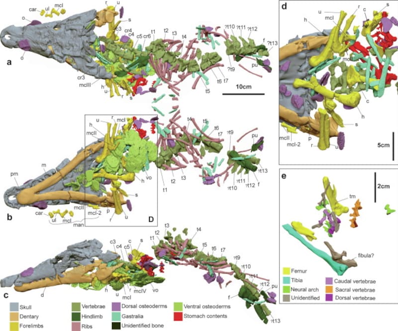 ¿Qué restos del animal fueron identificados? Si bien, no se ha podido descifrar la especie exacta de la presa, si fue posible identificar la mayoría de su cuerpo. Los investigadores señalaron la presencia de “tres vértebras dorsales, dos centros sacros, tres centros caudales distales, ambos fémures proximales, tibia izquierda y varios otros elementos que no pudieron identificarse a partir de los datos”.