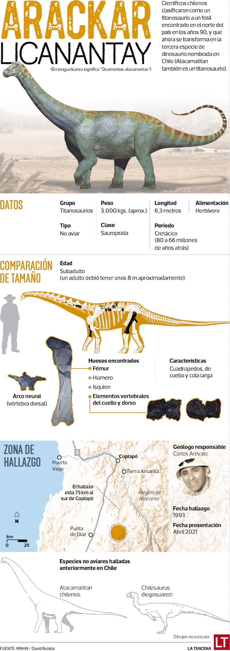 Después de casi tres décadas de su hallazgo, un grupo de paleontólgos describió el hallazgo de un geólogo en 1993 cerca de Copiapó como una nueva especie de titanosaurio, al que bautizaron Arackar licanantay, un animal de más de 6 metros que vivió en el Cretácico, es decir, entre 80 a 66 millones de años atrás.
