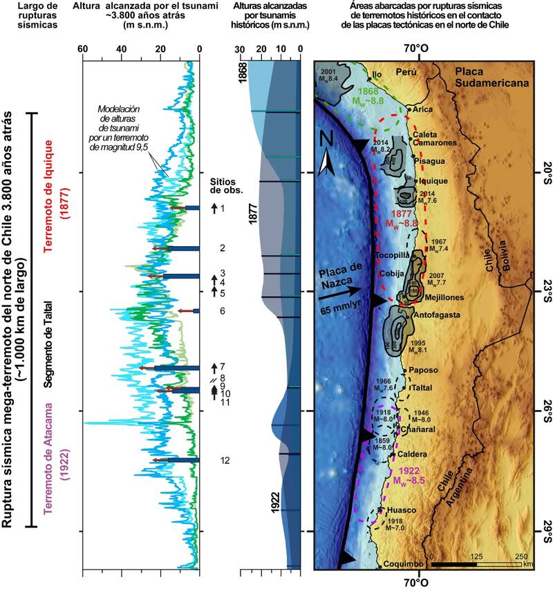Así lo concluye el estudio “Did a 3,800 year old Mw 9.5 earthquake trigger major social disruption in the Atacama desert?”, publicado en la revista Science Advances, una investigación liderada por los académicos de la Universidad de Chile Diego Salazar, del Departamento de Antropología de la Facultad de Ciencias Sociales, y Gabriel Easton, del Departamento de Geología de la Facultad de Ciencias Físicas y Matemáticas, junto a otros autores de diversas universidades y centros de estudio nacionales e internacionales. En ella, se señala la ocurrencia de un terremoto de magnitud 9,5, acompañado de un gran tsunami, que azotó la costa de buena parte del norte de Chile hace unos 3.800 años.