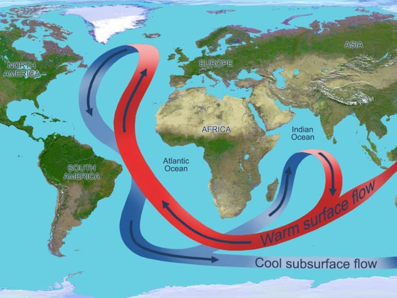 La llamada Circulación Meridional de Vuelco del Atlántico (AMOC por sus siglas en inglés) es una corriente que mueve agua cálida desde los trópicos ecuatoriales hasta Europa y el Atlántico norte. Este verdadero río marítimo más cálido que la temperatura media del Atlántico hace que el clima de Europa occidental sea suave y templado.