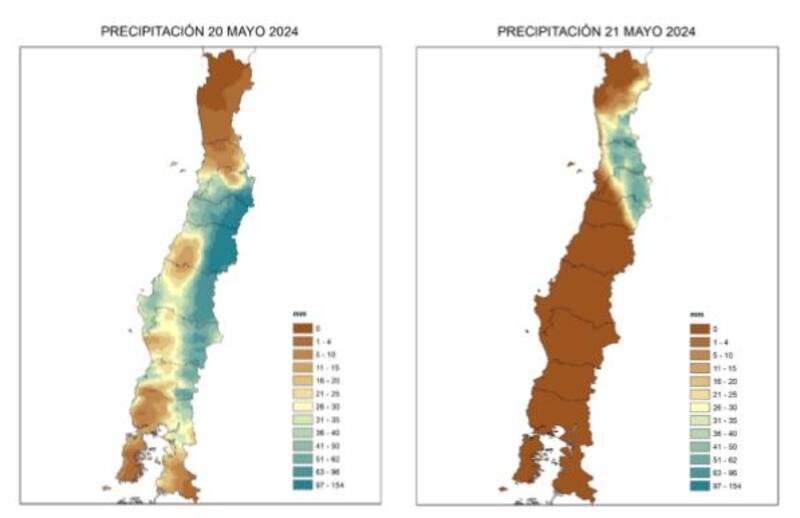 Para la Región del Maule se pronostican 66 mm en San Fernando, 76 mm en Chimbarongo, y cerca de 35 mm hacia la costa. En Ñuble bajaría la intensidad, llegando a 19 mm en Chillán y sus alrededores; en el Biobío, por su parte, las precipitaciones promediarían los 30 mm en la zona del valle central, mientras que hacia la costa 30 a 40 mm.