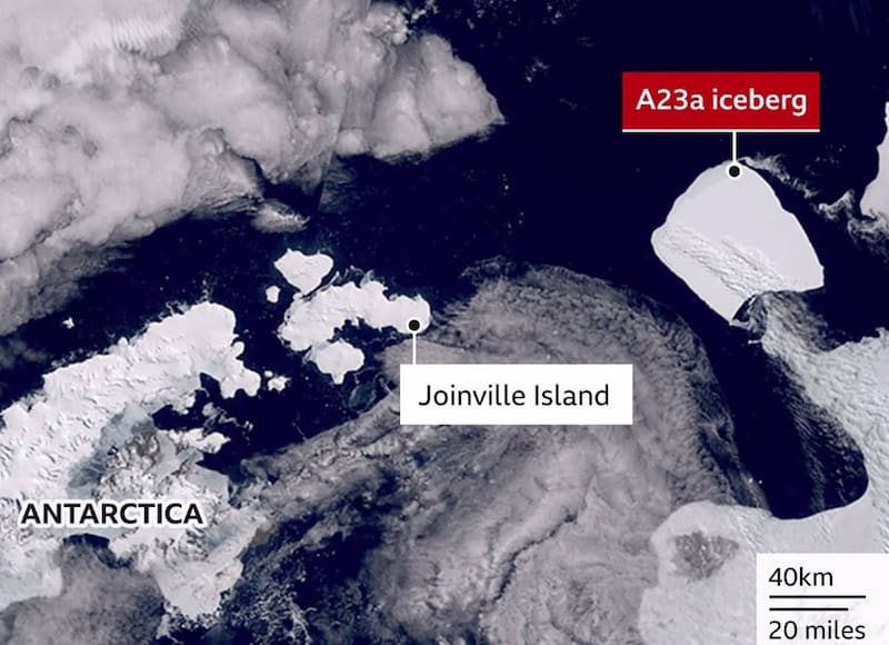 Se trata del iceberg gigante A23a, que mide 4.000 kilómetros cuadrados, y se separó de la Antártica en1986. Luego de más de tres décadas encallado en el mar de Weddell, se dirige en dirección al Atlántico sur.