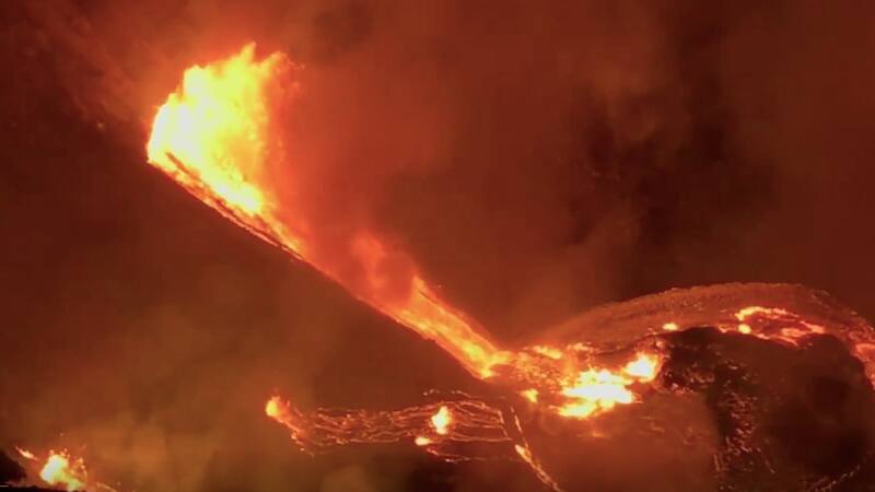 La erupción comenzó con la apertura de múltiples fisuras en las paredes del cráter Halemaumau, dijo el USGS, que mostró la cumbre de Kilauea iluminada por la lava caliente con una columna de vapor y gas saliendo del volcán.