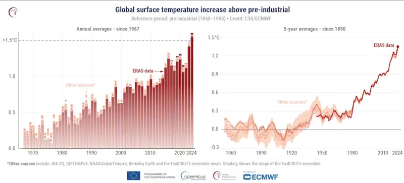 Un nuevo informe del Servicio de Cambio Climático Copernicus de la UE confirma que 2024 fue el primer año registrado con una temperatura media mundial superior a 1,5 °C por encima de los niveles preindustriales.