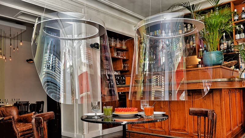 Gernigon logró dar forma a una especie de cápsula transparente que se asemeja a una pantalla de lámpara suspendida sobre las cabezas y torsos de los comensales de un restaurante. Publicó sus diseños en internet. Dice que recibe unos 50 pedidos al día y no sólo de restaurantes. Otros negocios como casinos, salas de espera de hospitales y salones de manicura también están interesados, afirma.