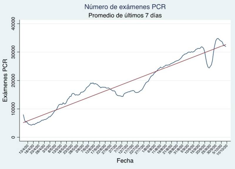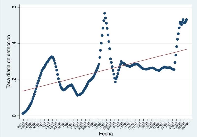 La única inferencia segura que se puede hacer al observar la evolución de la tasa diaria de detección es que ha mejorado en el tiempo, por el aumento en la cantidad de pruebas PCR realizadas, y a una caída en la velocidad de propagación del coronavirus.