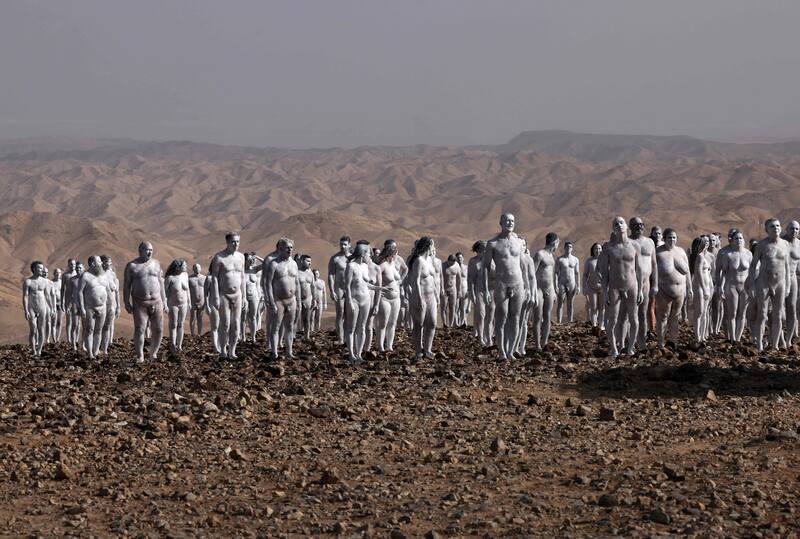 Unos 300 hombres y mujeres se desnudaron y se pintaron el cuerpo de blanco para una instalación artística destinada a llamar la atención sobre el retroceso del Mar Muerto.