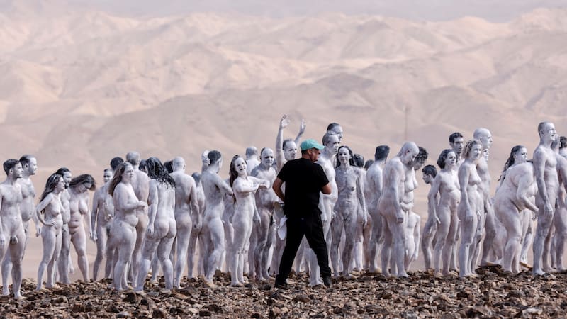Los voluntarios se reunieron a primera hora de la tarde del domingo. Se desnudaron y untaron sus cuerpos con pintura blanca en el desierto a las afueras de la ciudad israelí de Arad. La sesión duró alrededor de tres horas, con el artista posicionando a los modelos y la cámara.