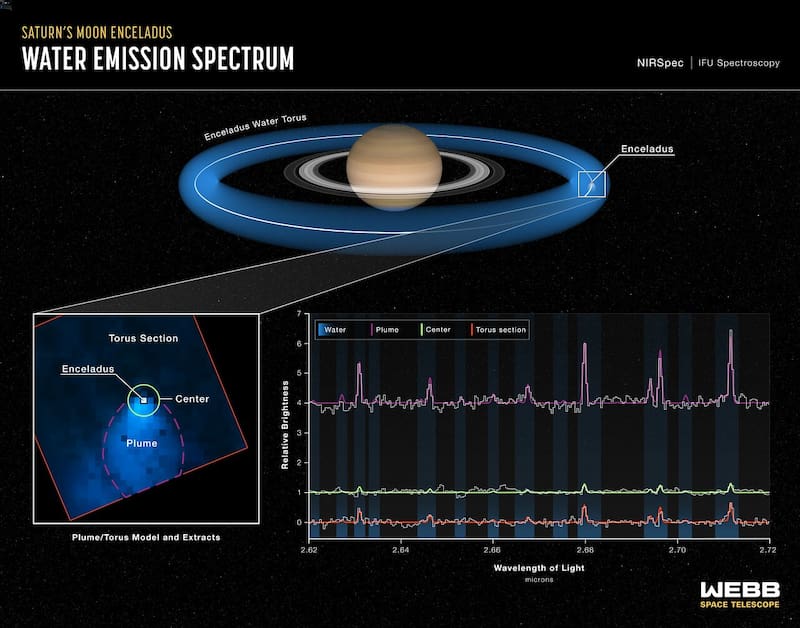 Las observaciones de Webb demuestran directamente cómo las columnas de vapor de agua de la luna alimentan el toroide, una rosquilla borrosa de agua que se encuentra junto al anillo E de Saturno. Al analizar los datos de Webb, los astrónomos han determinado que aproximadamente el 30% del agua permanece dentro de este toro, y el otro 70% escapa para suministrar agua al resto del sistema de Saturno.