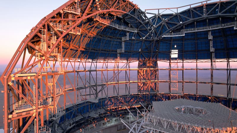 El domo es una estructura imponente de 80 metros de altura y 88 metros de diámetro, “casi como una cancha de fútbol”, y tendrá una masa de 6.100 toneladas que girará sobre 36 carros montados en su base a una altura de 12 metros del suelo. Se espera que para fin de año o principios de 2025 el domo esté cerca de completarse.