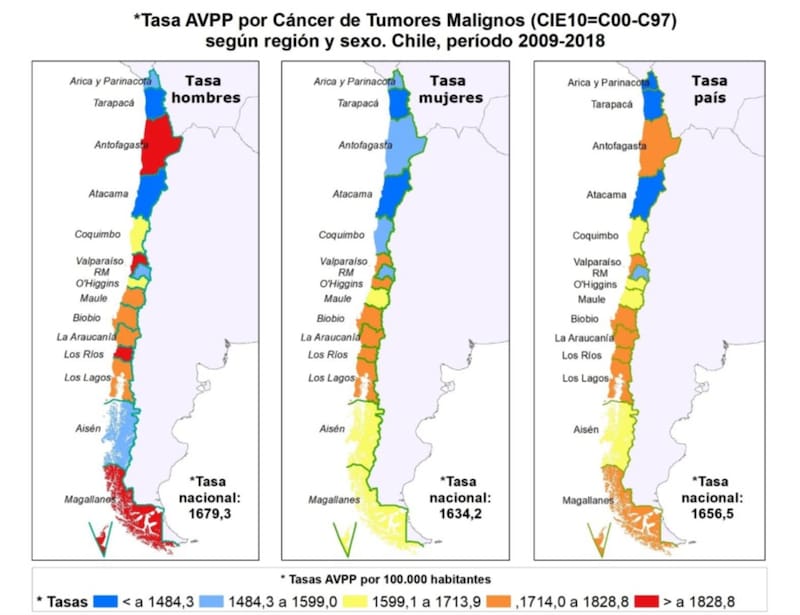 Por primera vez, un informe del Ministerio de Salud entrega mapas de mortalidad prematura por tumores malignos e informa de los Años de Vida Potencialmente Perdidos a nivel de regiones entre 2008 y 2019.