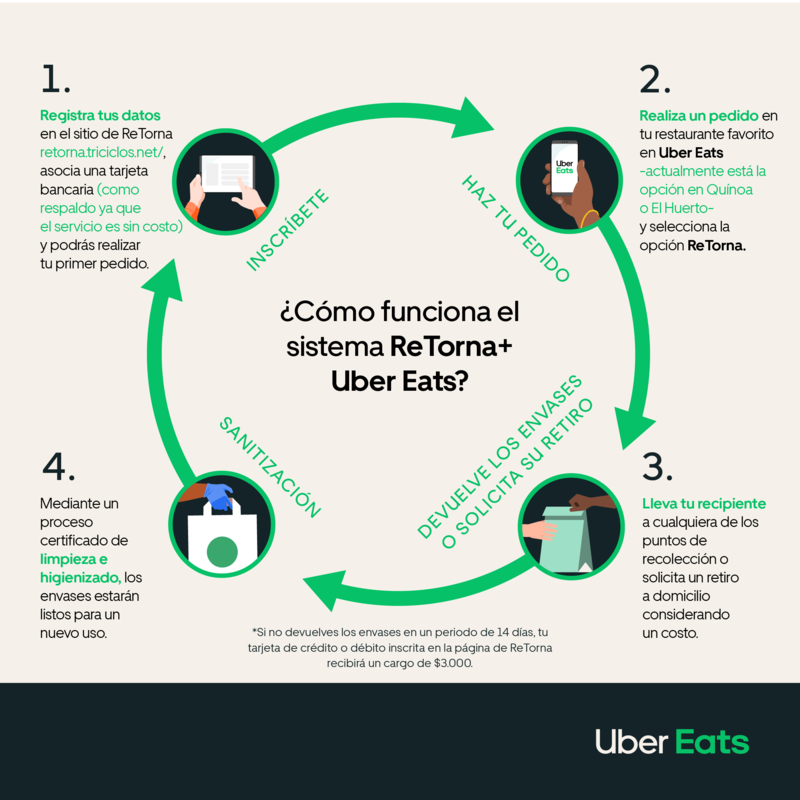 Para utilizarla, antes de hacer un pedido, el usuario debe inscribirse en la página: https://retorna.triciclos.net/. Luego, al hacer un pedido en Uber Eats en los restaurantes adheridos, le aparecerá de forma automática la opción “ReTorna” o “Platos ReTorna” porque la aplicación ya te reconocerá como usuaria de esta iniciativa.