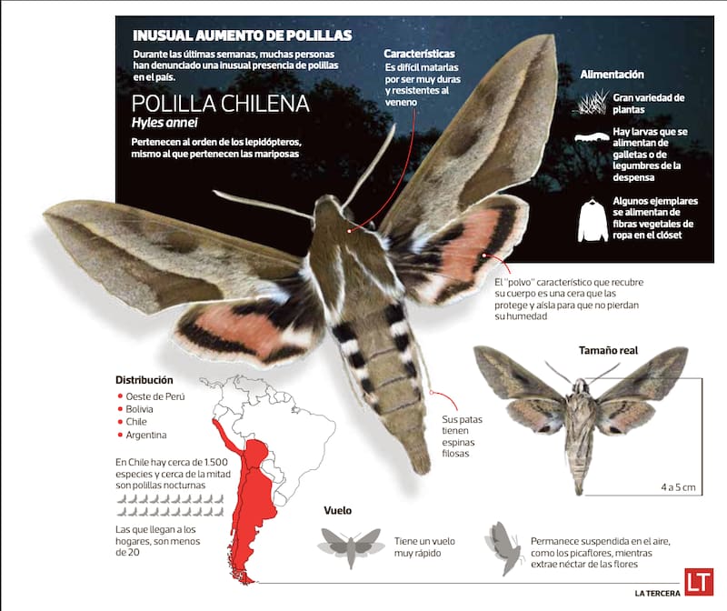 El inusitado aumento del insecto en los hogares, dado a conocer por usuarios de las redes sociales, podría ser producto del calor de la época, y un ciclo de vida más acelerado. En Chile existen casi 1.500 especies -incluyendo mariposas y polillas silvestres- siendo más de la mitad de ellas polillas nocturnas. De las que llegan a las casas, son sólo unas 20.