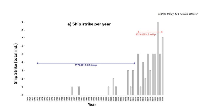 La investigación, identificó a Chile como el país con la mayor tasa de mortalidad de ballenas por colisiones con embarcaciones a nivel mundial en la última década.