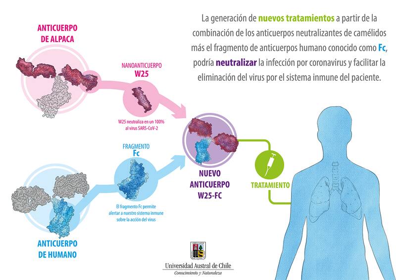 El trabajo realizado por el grupo de expertos del laboratorio de biotecnología médica de la Universidad Austral de Chile logró aislar poderosos y pequeñísimos anticuerpos de este camélido y los fusionó con fragmentos de anticuerpos humanos para generar inmunoterapia inyectable contra el Sars-CoV-2.