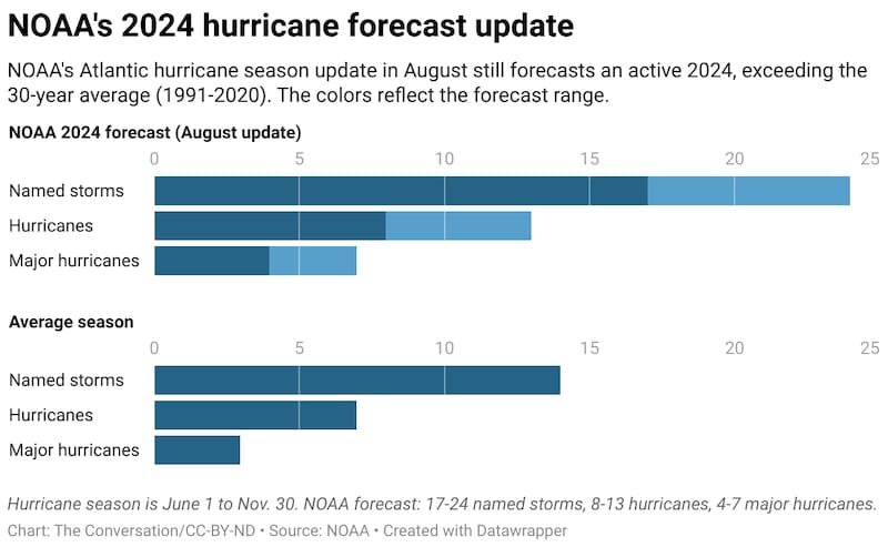 Sin embargo, la NOAA tiene en cuenta todos los factores cuando actualiza su pronóstico de la temporada de huracanes del Atlántico , publicado a principios de agosto, y aún anticipa una temporada extremadamente activa en 2024. La temporada de tormentas tropicales generalmente alcanza su punto máximo a principios o mediados de septiembre.