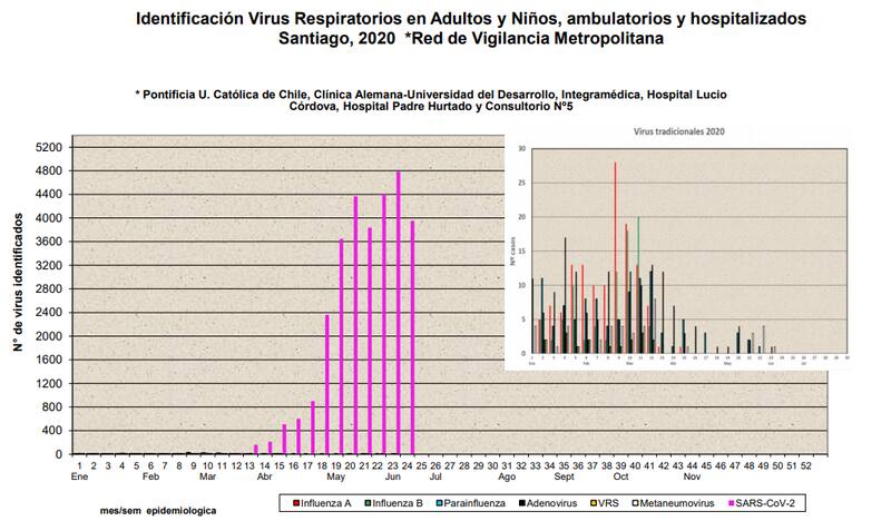 Considerando la semana 24 (desde el 8 al 14 de junio), el informe señala que la circulación de los virus tradicionales del invierno prácticamente ha desaparecido y “por primera vez”, la circulación del virus Sars-CoV-2 disminuyó. “El porcentaje de positividad de Covid-19 disminuyó por primera vez a 39%”, dice el documento, es decir, durante esa semana, de los 10.277 test PCR realizados en los recintos médicos de la Red Salud UC, Clínica Alemana UDD, el Hospital Lucio Córdova y el Hospital Padre Hurtado (todos en la Región Metropolitana), 3.952 resultaron positivos.