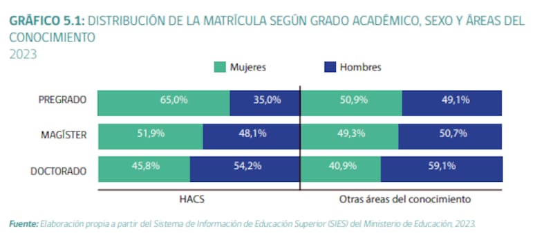 Para el año 2023, el pregrado de áreas del conocimiento HACS correspondía en un 65% de la matrícula a mujeres; baja a un 51, 99% en el magíster y a un 45,8% en el doctorado. Para otras áreas del conocimiento, las mujeres representan el 50,9% de las matrículas en el pregrado, 49,3% en el magíster y 40,9% en el doctorado.