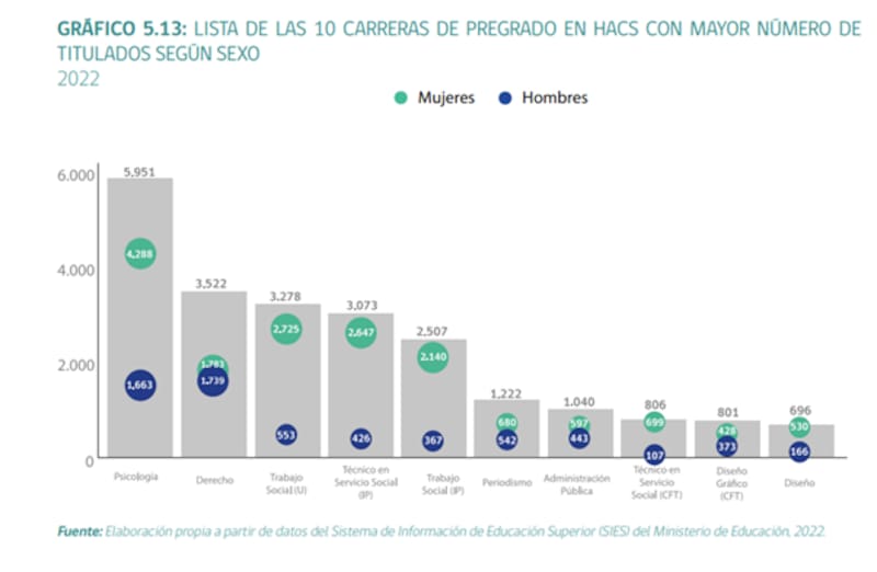En segundo lugar, se ubica Derecho con 3.522 personas tituladas (1.783 mujeres y 1.739 hombres); Trabajo Social con 3.278 (2.725 mujeres y 553 hombres); Técnico en Servicio Social 3.073 (2.647 mujeres y 426 mujeres). Más abajo en el ránking están Periodismo, Administración Pública, Diseño Gráfico y Diseño.