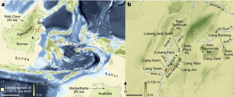 En 2018, parte del arte rupestre conocido más antiguo se encontró en cuevas de Kalimantan Oriental, Borneo, que data de hace 40 000 años.